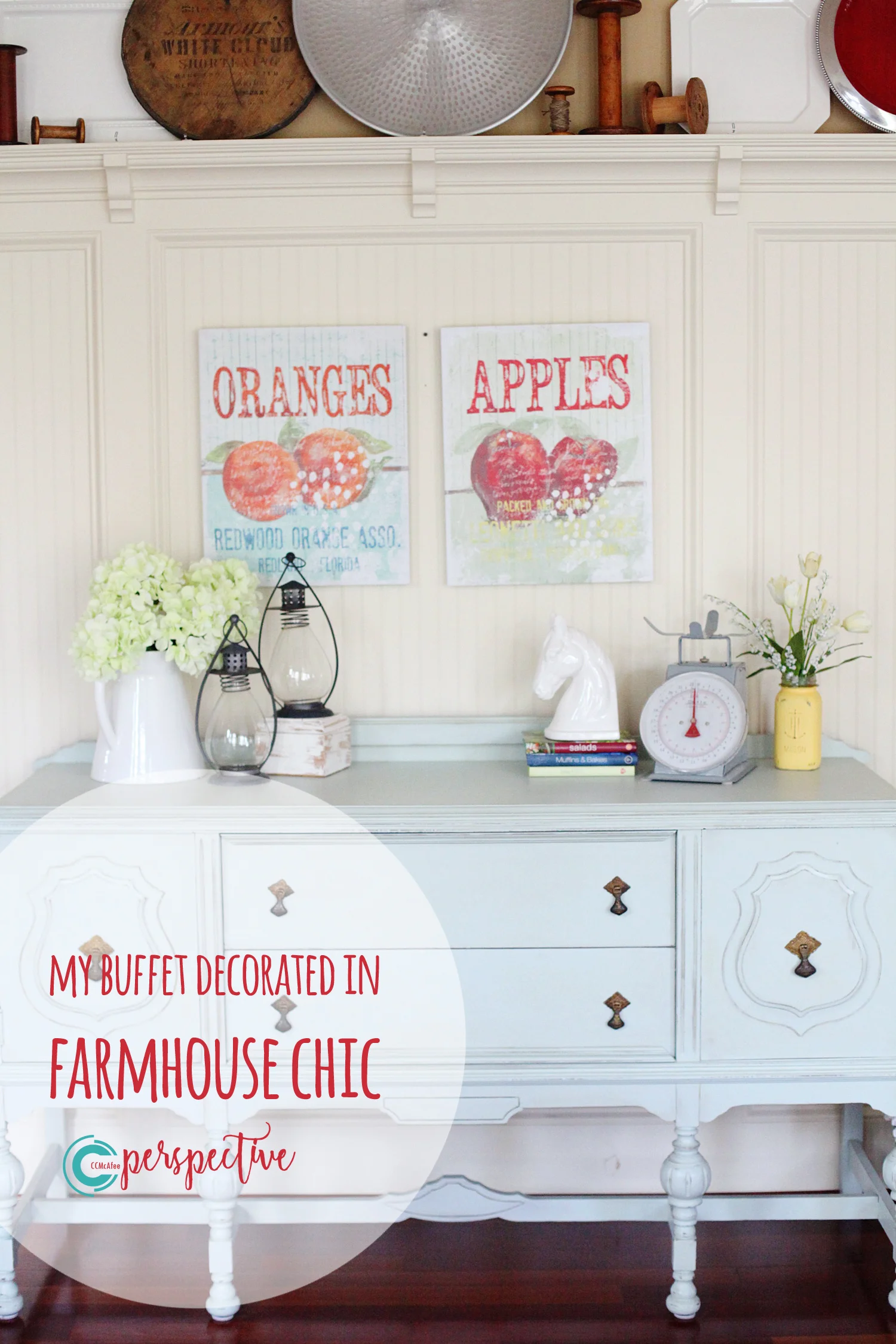 I love dumpster diving, treasure hunting, antiques etc. I also love color and contemporary things. I decorated my buffet in a chic farmhouse style, a mix of both worlds. I mixed old items with new items, dull and colorless with bright and happy!